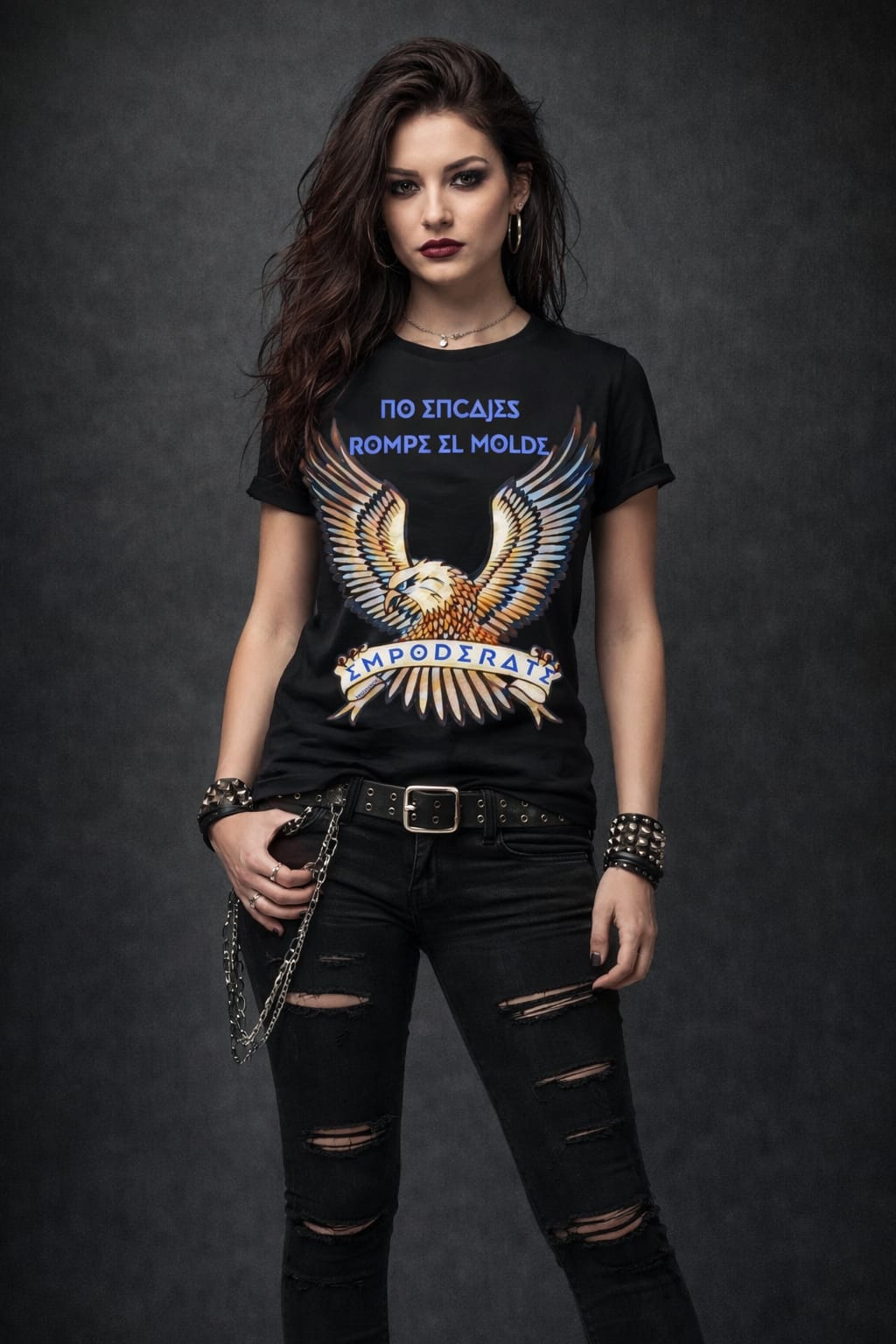 El águila simboliza libertad, fuerza y la capacidad de elevarse por encima de los límites. En esta camiseta el diseño transmite un mensaje claro: no seguir el camino marcado y atreverse a romper el molde.