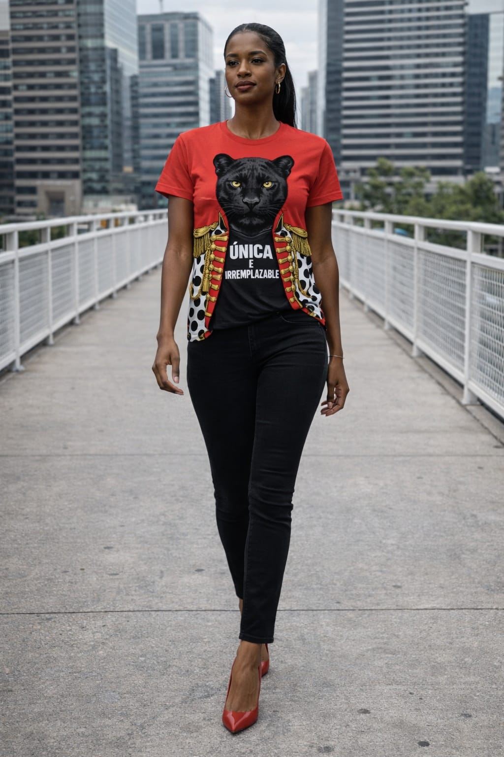 La pantera representa fuerza, carácter y elegancia. En esta camiseta el diseño transmite exactamente eso: una actitud segura, independiente y con personalidad propia. El mensaje “Única e Irremplazable” refuerza la idea de que no hay dos personas iguales y que cada mujer tiene su propio estilo y forma de destacar.