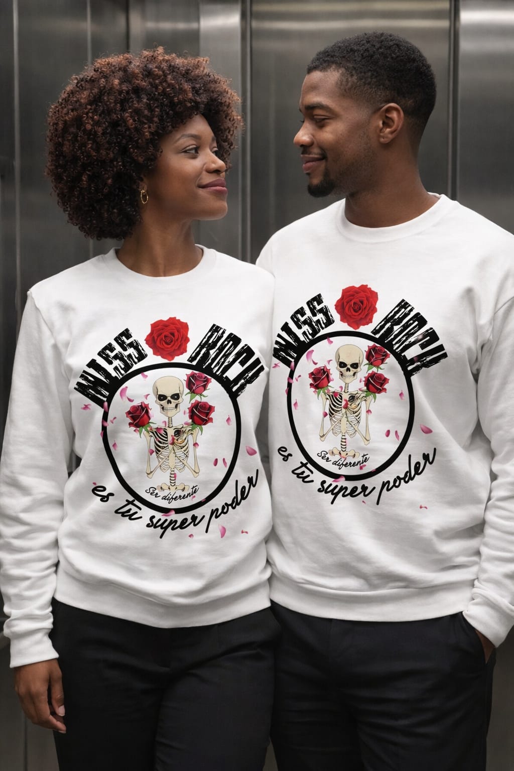 Esta sudadera transmite un mensaje claro: la diferencia es fuerza. El diseño combina una estética rockera con una ilustración de calavera rodeada de rosas, creando un contraste entre rebeldía y belleza que refleja perfectamente el espíritu Miss Rock.